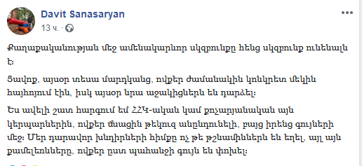 Отстраненный от исполнения служебных обязанностей глава Государственной контрольной службы Давид Санасарян на своей странице в Фейсбук пишет: