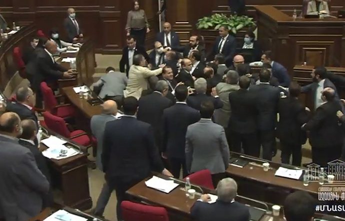 Сегодня в Национальном Собрании Армении произошел инцидент с участием главы партии «Просвещенная Армения» и председателя ее парламентской фракции Эдмона Марукяна и депутата от правящего блока «Мой шаг» Сасуна Микаеляна. Короткая словесная перепалка между Марукяном, который выступал в тот момент с парламентской трибуны, началась после реплики с места депутата фракции «Мой шаг», затем в спор вмешался также Сасун Микаелян, вслед за чем последовала уже рукопашная. Вмешавшимся депутатам не сразу удалось развести разгоряченных депутатов.