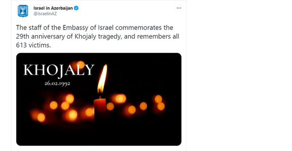 В связи с 29-й годовщиной Ходжалинских событий Посольство Израиля в Азербайджане разместило на официальной странице посольства в Twitter публикацию, к которой говорится: «Посольство Израиля отмечает 29-ю годовщину Ходжалинской трагедии и чтит память всех 613 жертв».