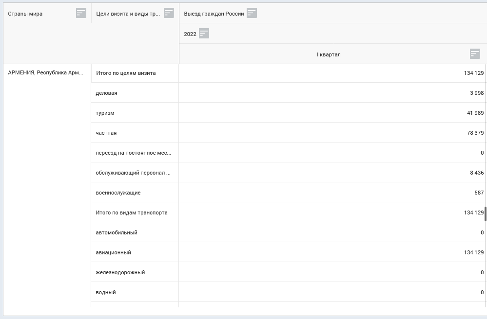 Согласно данным Единой межведомственной информационно-статистической системы (ЕМИСС) Федеральной службы государственной статистики РФ за первый квартал 2022 года о выехавших из страны россиянах, число покинувших страну граждан значительно возросло. При этом поток россиян в Армению по сравнению с аналогичным периодом прошлого года увеличился в три раза.