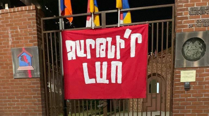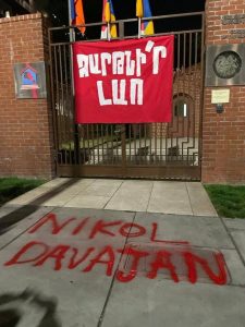 У входа в здание консульства Армении в Лос-Анджелесе протестующие вывесили баннер со словами патриотической песни “Зартнир, Лао” и написали “Никол – предатель”.