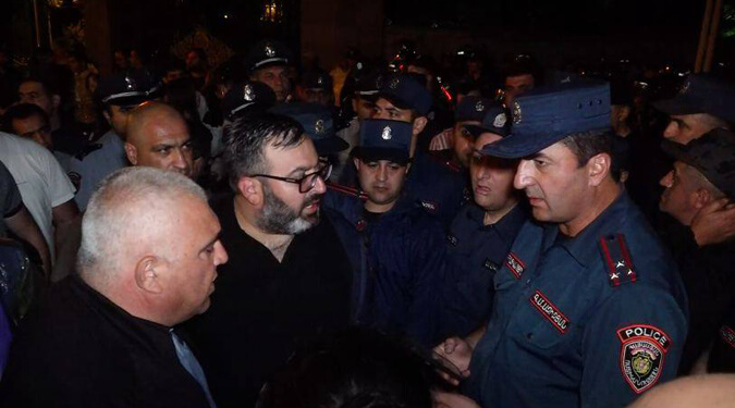 Однако протестующие не расходятся, оставаясь по обе стороны от разделяющего их полицейского кордона на улицах Баграмяна и Демирчяна. Между демонстрантами и полицейскими уже произошли две стычки.